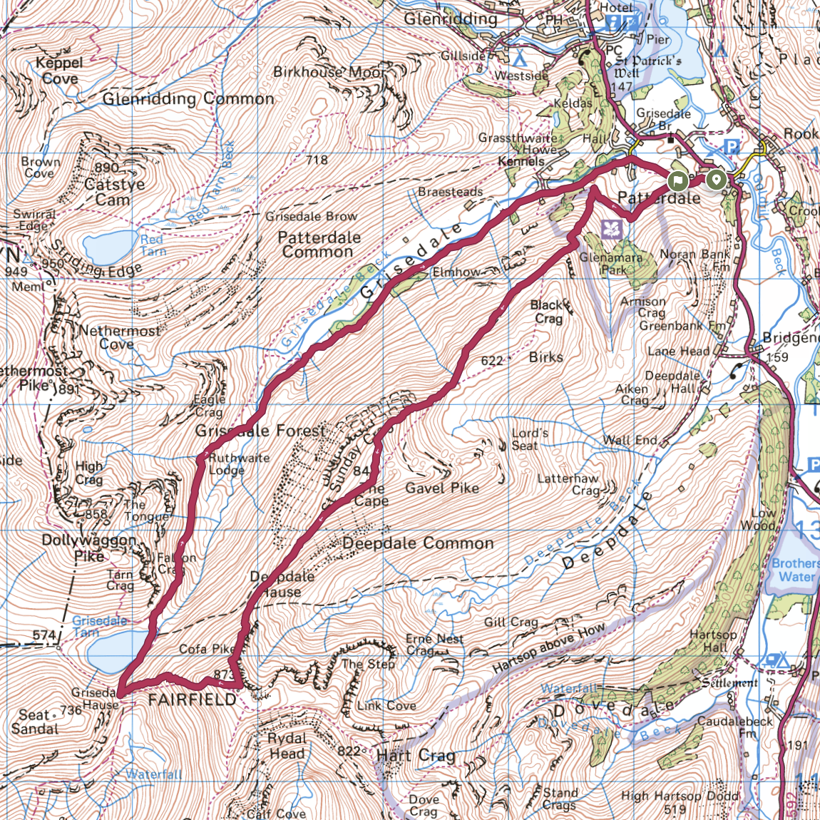Beginning at the Patterdale Hotel, the route climbs to St Sunday Crag before continuing via Cofa Pike to the summit of Fairfield, with expansive views along the way. We then descend into Grisedale and follow the valley back to Patterdale.